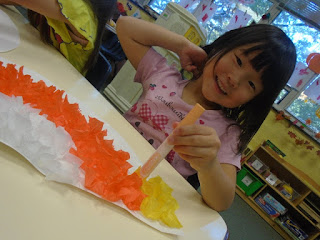 虹の様な形の紙に小さく切った花紙をつけていきます。